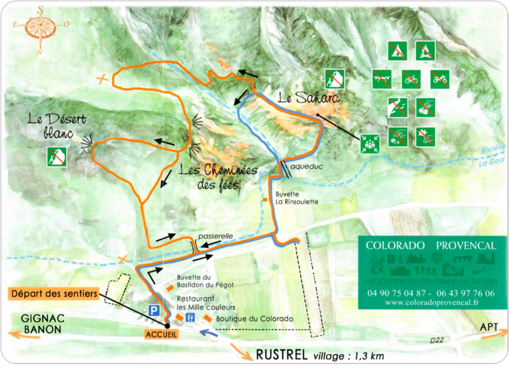 Beim Parkplatz erhält man kostenlos eine Karte des Wandergebiets mit seinen Rundwegen. Da die Wegmarkierungen je nach gewählter Strecke nicht überall optimal sind, empfiehlt sich ggf. die Mitnahme eines GPS-fähigen Smartphones o.Ä. Ein Blick zuvor auf die Website kann beim Auswählen der geeigneten Strecke jedoch sehr hilfreich sein: www.coloradoprovencal.fr
